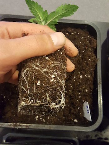 Het jonge plantje in de volle grond zetten is ook niet moeilijk: schep de aarde op de aangewezen plek om, en haal het kleine wietplantje uit het potje. Hou het potje daarvoor met je ene hand ondersteboven, met het plantje voorzichtig tussen je wijs- en middelvinger (zie de foto’s hieronder). Knijp met je rechterhand zachtjes in het potje totdat de kluit loskomt. Vervolgens graaf je de kluit in de omgeschepte aarde in. Zorg ervoor dat de twee kleine ronde lobblaadjes net boven de grond uitsteken, de rest mag ingegraven worden.