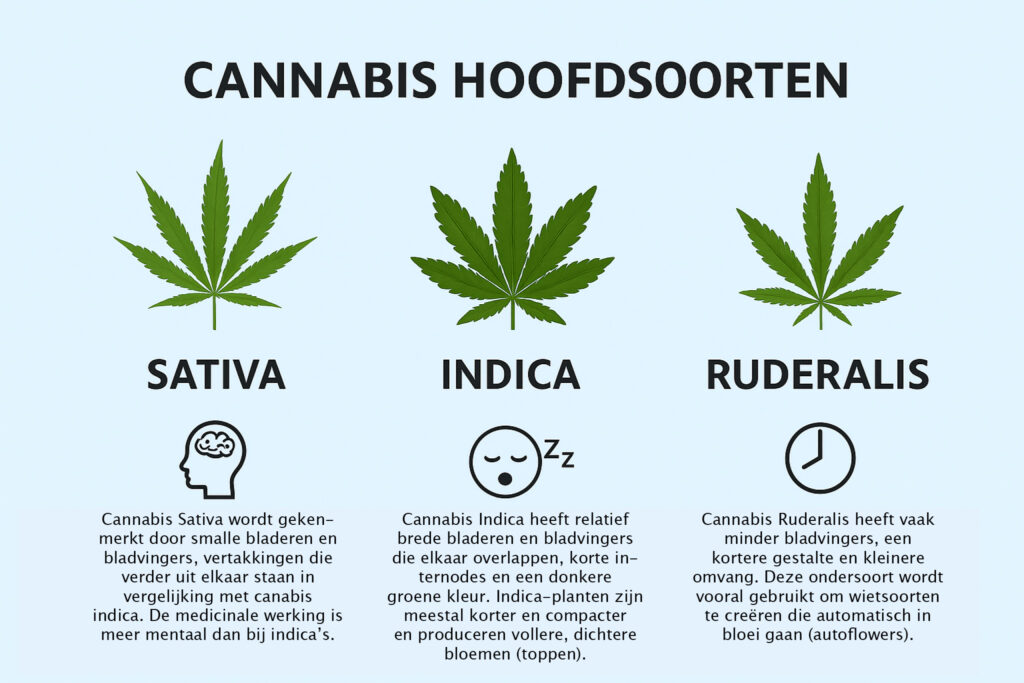 Indica en sativa zijn twee hoofdsoorten cannabis die door natuurlijke selectie in de natuur zijn ontstaan. Ze hebben ieder hun eigen (medicinale) eigenschappen. Door ze te kruisen maken zadenbedrijven hybride wietsoorten met de gewenste eigenschappen uit beide wietfamilies.