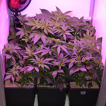 Zoals jullie weten kweek ik deze keer de sativa dominante Dinamed CBD en de indica dominante Candy Dawg Kush naast elkaar in mijn kweekkast. Sativa’s strekken doorgaans meer dan indica’s maar dankzij de training is het bladerdek redelijk gelijk gebleven. Rechts achterin de kast bleef één van de Candy Dawg Kush planten qua hoogte wel een beetje achter op de rest. Om dit te compenseren heb ik deze pot op een verhoging gezet.
