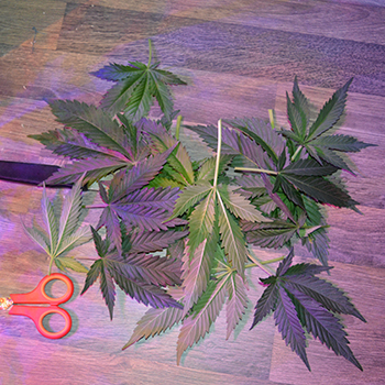 Verder heb ik hier en daar wat grote schutbladeren weggehaald die me teveel licht wegnamen van andere toppen. Met name de Candy Dawg Kush heeft enorme bladeren die meer licht tegenhouden dan een parasol op een zomers terrasje. Door ze hier en daar weg te halen wordt het licht beter over alle planten verdeeld en kan lucht ook weer wat makkelijker door de planten blazen.