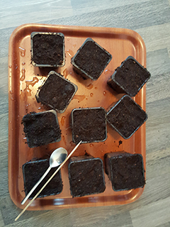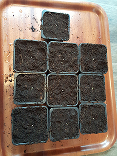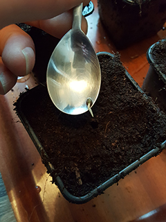 Vul dus drie potjes met aarde en giet daar alvast een klein beetje water op. Maak met een stokje of de achterkant van een theelepeltje alvast een klein gaatje in het midden in de grond. Pak nu voorzichtig het bruine filterpapier met de zaadjes uit het plastic zakje, en leg het weer even op een bord. Vouw het open en pak één voor één de zaadjes op. Dit gaat het makkelijkst met een theelepeltje. Als je het worteltje over de rand van het theelepeltje laat hangen kun je het gemakkelijk daarmee in de aarde laten zakken.