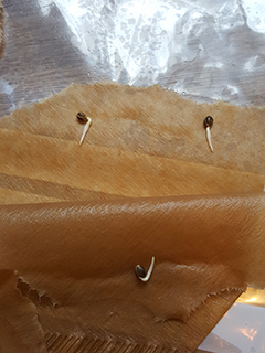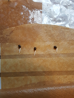 Na twee dagen kun je kijken of je zaadjes zijn uitgekomen, door het zakje tegen het licht te houden. Je ziet dan een soort staartje uit ieder zaadje komen. Dat staartje is het allereerste worteltje. Het is belangrijk dat het worteltje meteen in de grond gestopt wordt zodra je het kunt zien. Je zaadje heeft namelijk ook voedingsstoffen nodig om te groeien, en die zitten in de grond. Laat de wortels daarom nooit langer worden dan een centimeter of twee voordat je ze in de grond zaait.