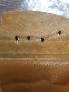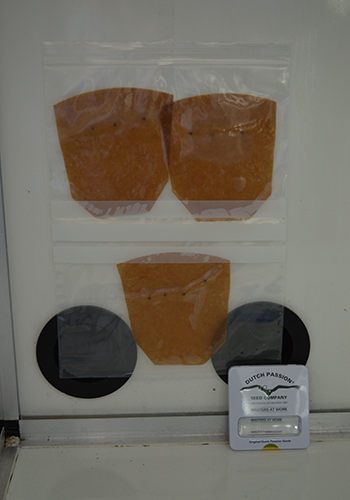 Stop het natte filter met daarin de wietzaden in het plastic diepvrieszakje, en hang het met een plakbandje op aan de binnenkant van een kastje, zodat het in het donker hangt. Ontkiemen gaat namelijk het beste in het donker, net als in de natuur waar de zaden onder de grond ontkiemen.