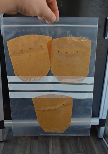 Ontkiemen in een plastic zakje gaat altijd goed en is erg makkelijk en leuk om te doen. Al na een dag of twee kun je, wanneer je het zakje tegen het licht houdt, het allereerste worteltje zien zitten. Haal in de supermarkt dus even wat hersluitbare plastic diepvrieszakjes, en wat ongebleekte koffiefilters, want dat heb je nodig bij deze manier van ontkiemen.