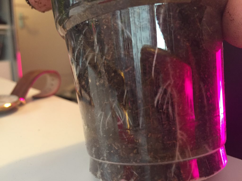 En ja hoor, er verschijnen lange wortels aan de zij- en onderkant van de bekertjes. Eigenlijk ben ik een dag of twee later dan ik had gehoopt. Want ideaal gezien verpot je de plantjes vóórdat de wortels onderaan de ‘beginpotjes’ rond gaan op zoek naar meer ruimte. Anyway, ik bereid snel de 11-liter eindpotten voor op het verpot-avontuur om geen tijd meer te verliezen.