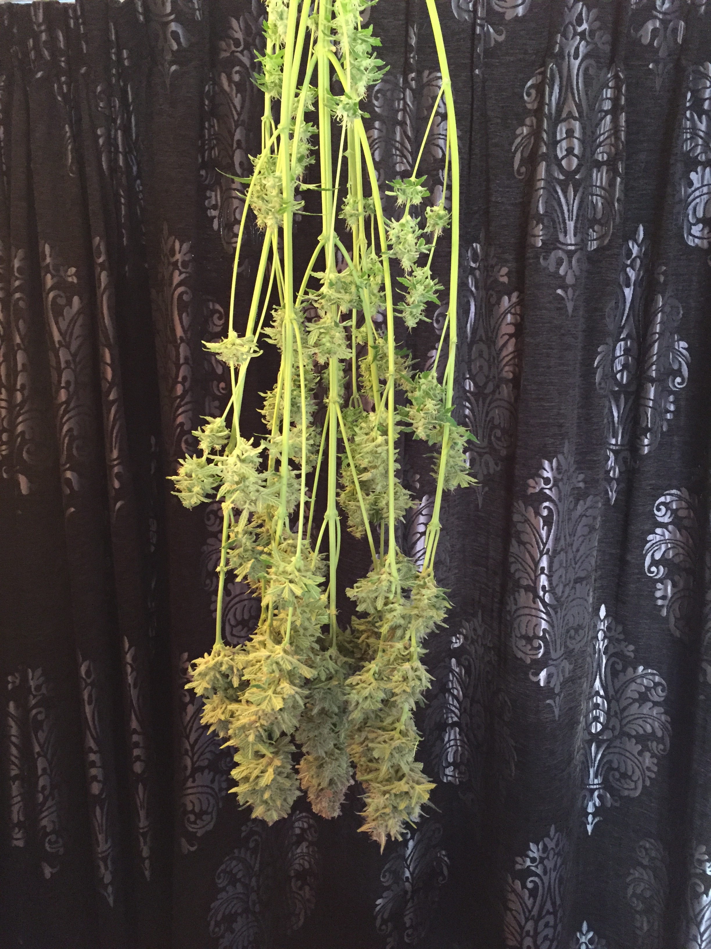 Weer even een update, de Black Cream is geknipt en klaar voor het curen. De opbrengst viel toch een beetje tegen maar dat mag de pret niet drukken. Uiteraard heb ik al even een kleine “nosing and tasting” sessie gedaan. De lucht die er vanaf komt is een beetje chemisch, je zou het ook als diesel kunnen omschrijven (er zit diesel genetica in dus dat komt aardig overeen). De geur is ook redelijk intens en vult de ruimte hier met gemak. De smaak die ik kreeg deed me gelijk denken aan old school hasj en als ex-fanatiek hasj roker was dit een plezierige bijkomstigheid zeker omdat ik niet echt van de diesel lucht hou. De uitwerking deed mij ook denken aan vroeger want ik kreeg er namelijk ouderwets bolle ogen van, iets wat ik al een tijdje niet meer gehad heb. Veel activiteiten moet je niet meer plannen na deze wiet want er zat niet heel veel beweging meer in nadat ik ze geproefd had en ik kon niet veel meer dan blij voor mij uit staren. De kleur is mooi donker geworden en geeft een leuk contrast met de oranje bloeiharen, de buds zijn ook zeer kleverig en gebruik van een grinder wordt aangeraden. Tot zover de update, geniet van de zondag en eigenlijk gewoon van elke dag. Tot de volgende.