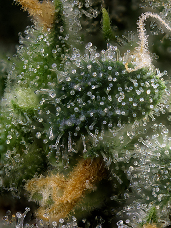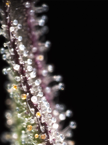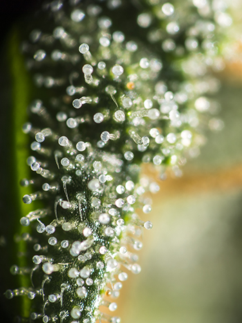 Trichomen: Als je de trichomen door een microscoop of loep bekijkt, zie je dat ongeveer de helft daarvan nog helder / transparant van kleur is, en de andere helft inmiddels al wittig en troebel van kleur is geworden. Het zijn de wittige trichomen die het meeste THC bevatten.